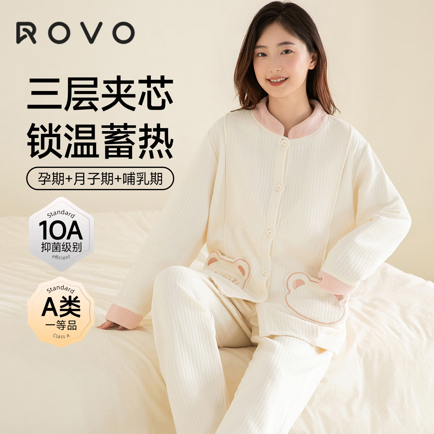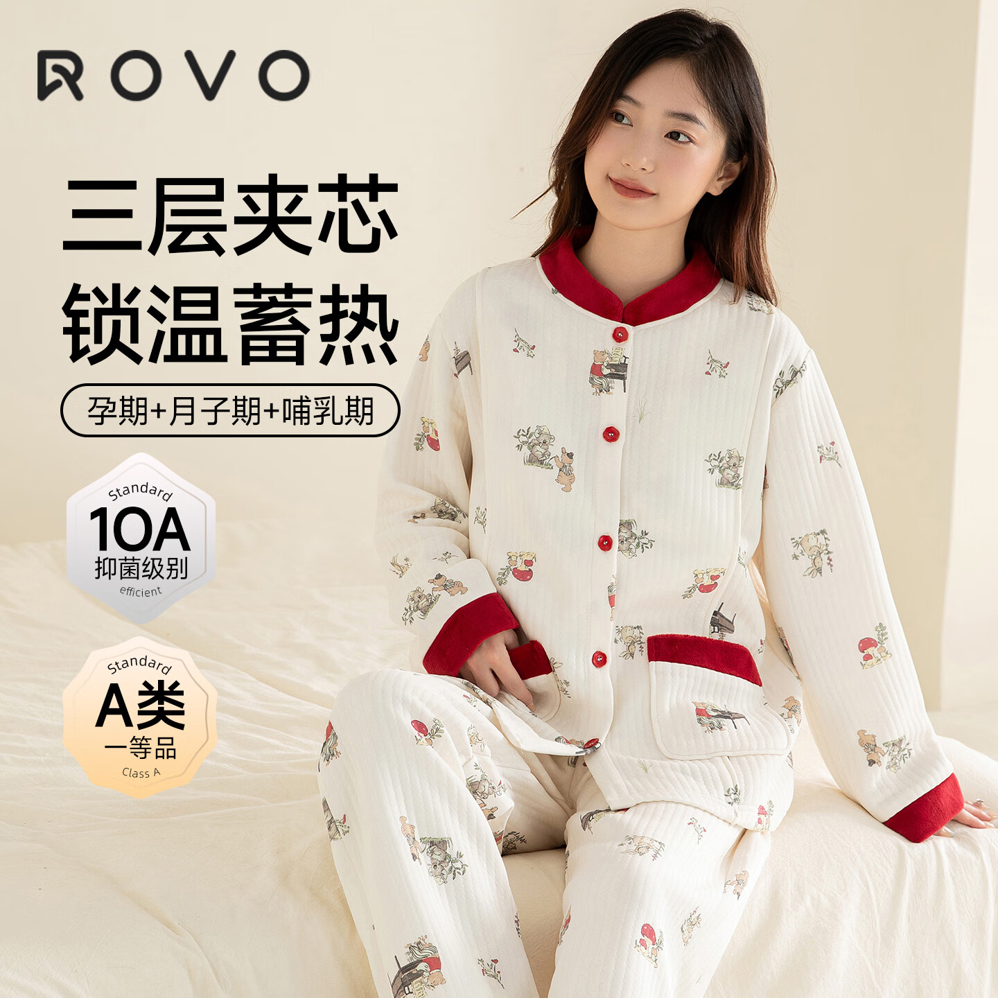 ROVO纯棉月子服秋冬产后孕妇哺乳睡衣A类怀孕期产妇家居服套装 【秋冬260克】熊熊口袋(适用于5℃-20℃) L