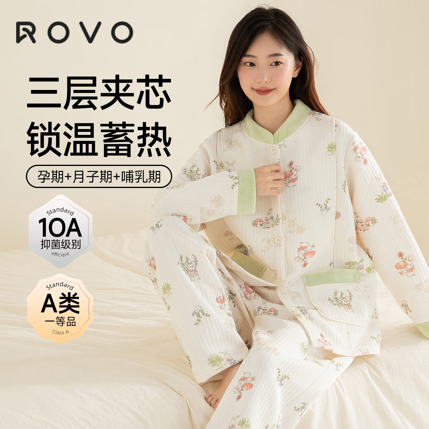 ROVO纯棉月子服秋冬产后孕妇哺乳睡衣A类怀孕期产妇家居服套装 【秋冬260克】蘑菇花园(适用于5℃-20℃) L
