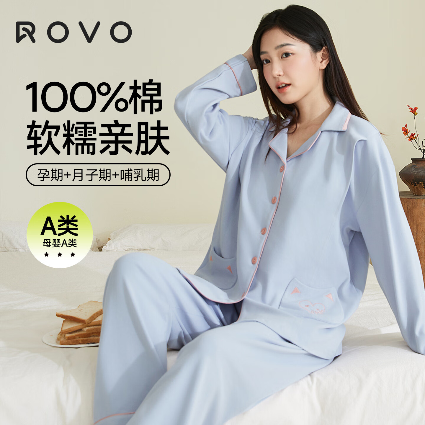 ROVO纯棉月子服秋冬产后孕妇哺乳睡衣A类怀孕期产妇家居服套装 【四季180克】口袋喵蓝色(适用于15℃-23℃) 2XL