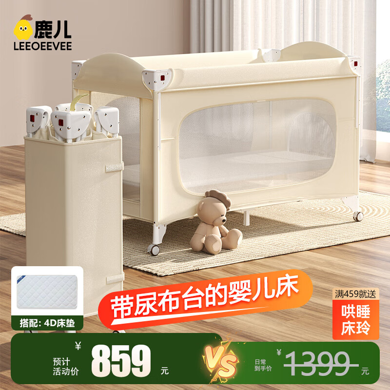leeoeevee鹿儿婴儿床新生折叠拼接大床便携可移动bb宝宝床多功能小户型床 尿布台款+4D空气纤维床垫(可拆洗)