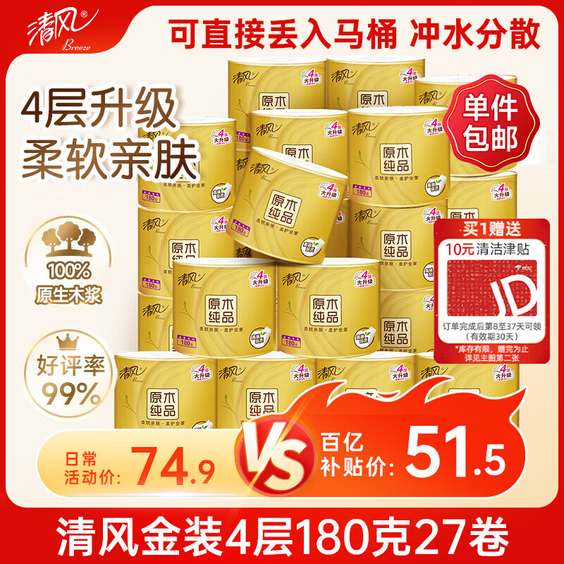 清风有芯卷纸原木金装 4层180克*27卷 卫生纸纸巾 箱装 厕纸 卷筒纸
