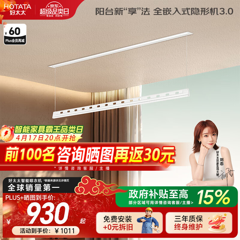 好太太隐形晾衣架电动晾衣机隐藏式自动智能升降阳台嵌入式晒衣架 D-3196:1.5米单杆被杆+照明