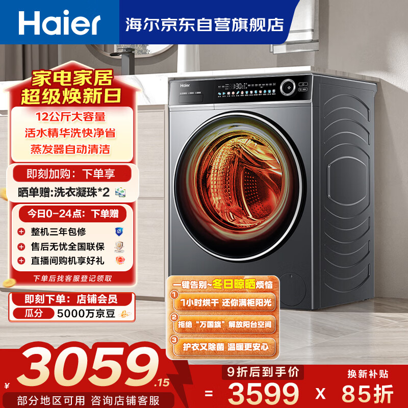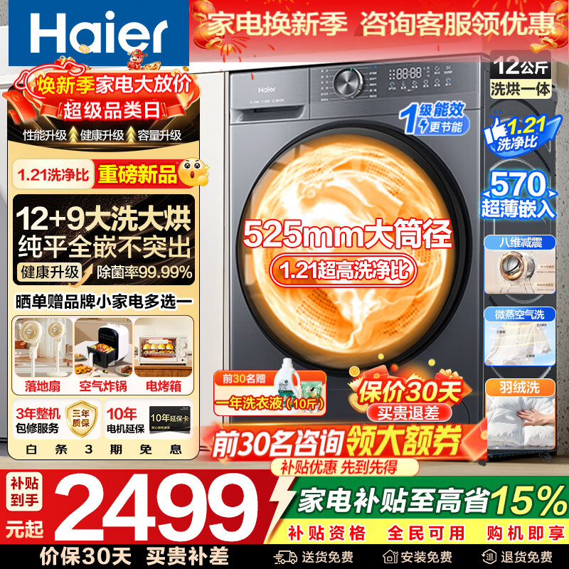 海尔(Haier)滚筒洗衣机全自动带烘干洗烘一体 12公斤大容量超薄 家电国家补贴京东自营659H 一级能效 洗羽绒服
