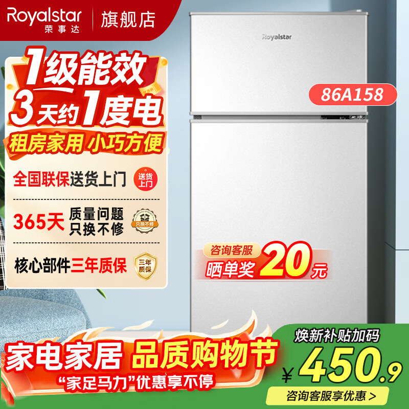 荣事达(Royalstar)小冰箱小型家用出租房双门一级能效宿舍冷藏冷冻两用节能电冰箱 86A158【一级能效】【三天不到1度电】银
