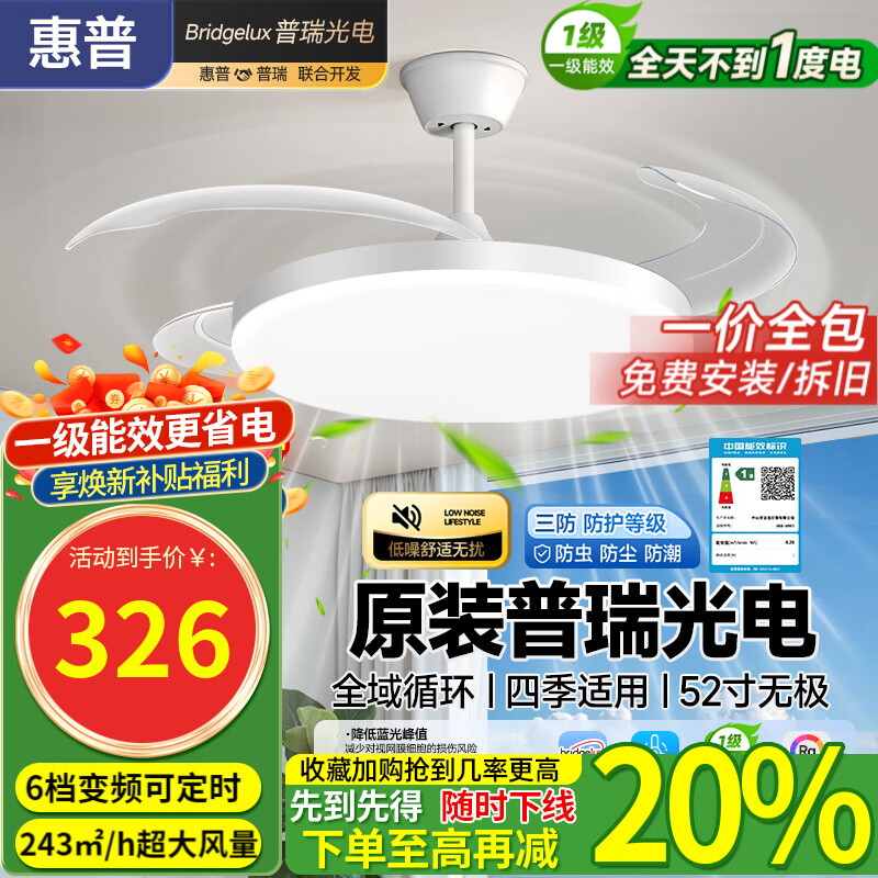 惠普风扇灯普瑞护眼LED隐形扇叶餐厅卧室遥控调光一体无叶吊扇灯中山 1级能效/吊杆52寸普瑞光/遥控无极