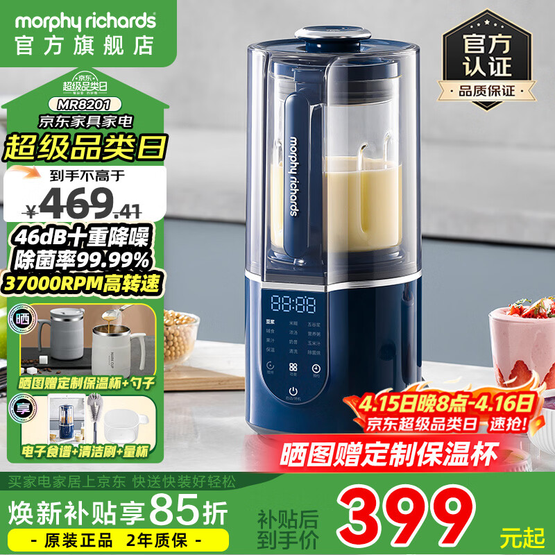 摩飞电器(Morphyrichards)柔音破壁机家用豆浆机轻音全自动1.5L大容量多功能料理机十重降噪自动清洗定时预约免滤无渣 MR8201轻奢蓝