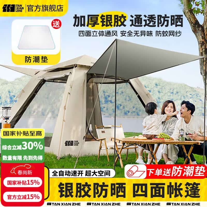 探险者(TAN XIAN ZHE)帐篷户外露营防雨过夜3人-4人速开便捷天幕二合一黑胶防晒帐篷 【特惠套餐】5-8人帐篷+防潮垫