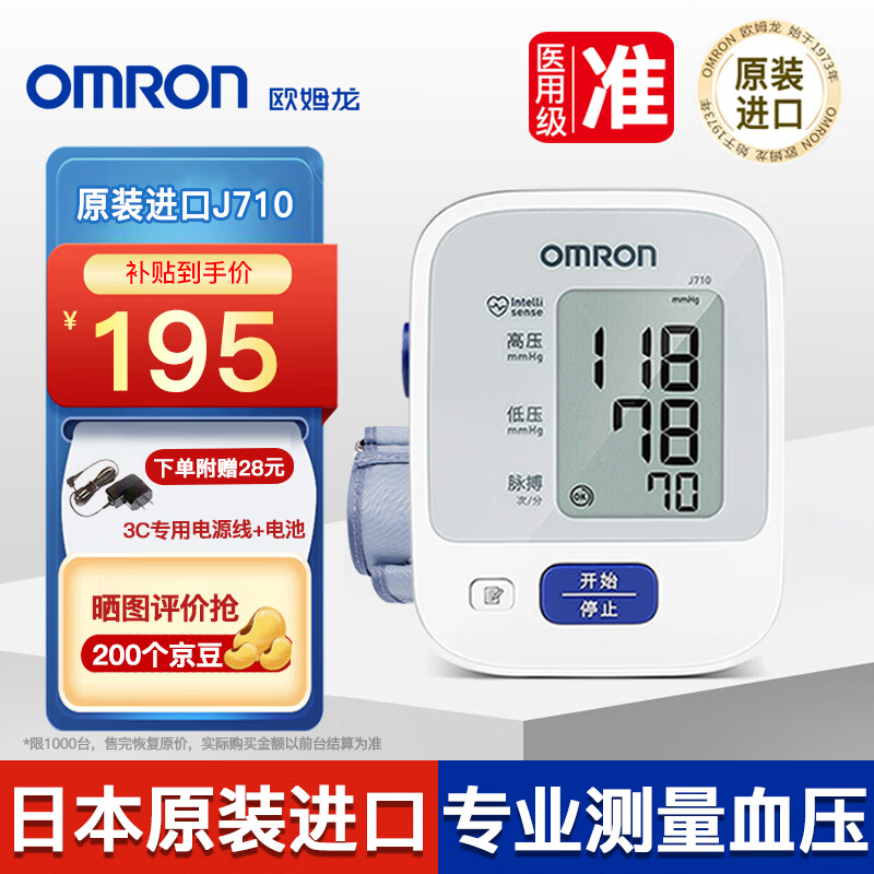 欧姆龙(OMRON)电子血压计 血压测量仪家用医用高精准血压仪 老人高血压测量仪器 【原装进口】J710电源款+3C电源线+4节电池