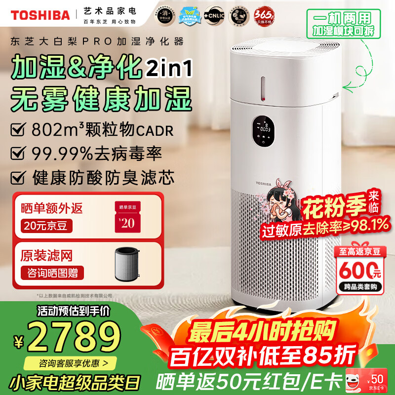 东芝(TOSHIBA)加湿器空气净化器无雾加湿净化一体机除花粉过敏源除醛除菌除敏母婴家用家用消毒杀菌大白梨Pro