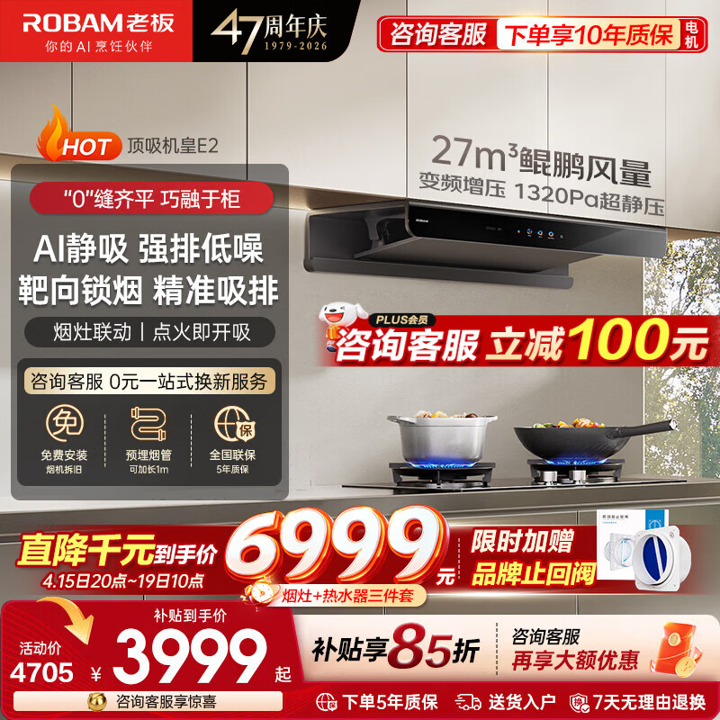 老板(Robam)【抢烟灶热6999】双子星E2机皇27风量欧式抽吸油烟机燃气灶具套装智能巡航增压1320Pa挥手智控 【单烟机】旗舰款E2/27巡航风量/纤薄低噪