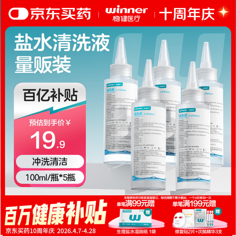 稳健医用生理盐水清洗液100ml*5瓶便携尖嘴0.9%氯化钠冲洗液