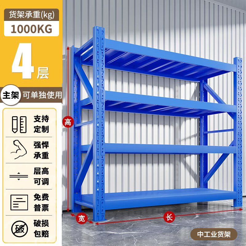 净魔师货架置物架仓储仓库家用落地储物间货物架加厚全钢多层展示架子 四层货架-中工业【1000KG】 --灰白/蓝色/黑黄/黑色/橘蓝--