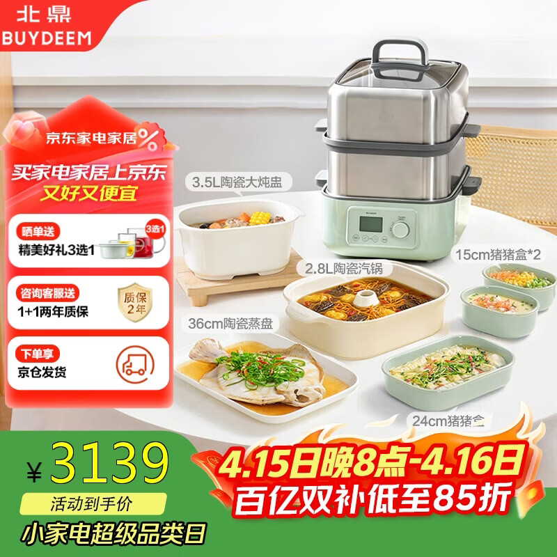 北鼎(Buydeem)【价低广交会】电蒸锅全钢0涂层电炖锅蒸炖锅大容量【全家福】G76浅杉绿+汽锅+炖盅+蒸盘+猪猪盒