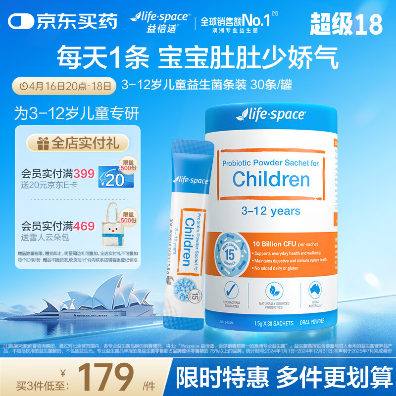 Life Space儿童3岁-12岁幼儿益生菌粉条装活菌提升自护力30条/罐澳洲进口