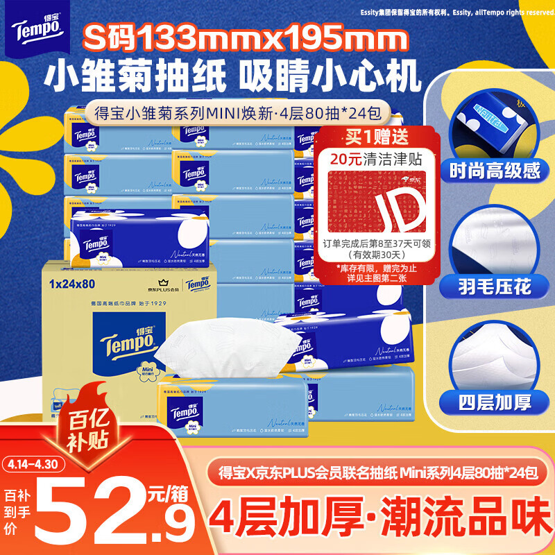 得宝(TEMPO)一博同款 抽纸 小雏菊系列4层80抽*24包 餐巾纸 卫生纸 纸巾S码