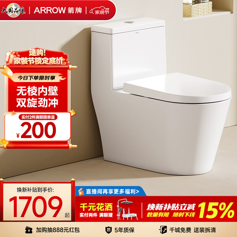 箭牌(ARROW)T95马桶双漩大冲力虹吸防堵缓降连体坐便器 AEB12648M 305坑距