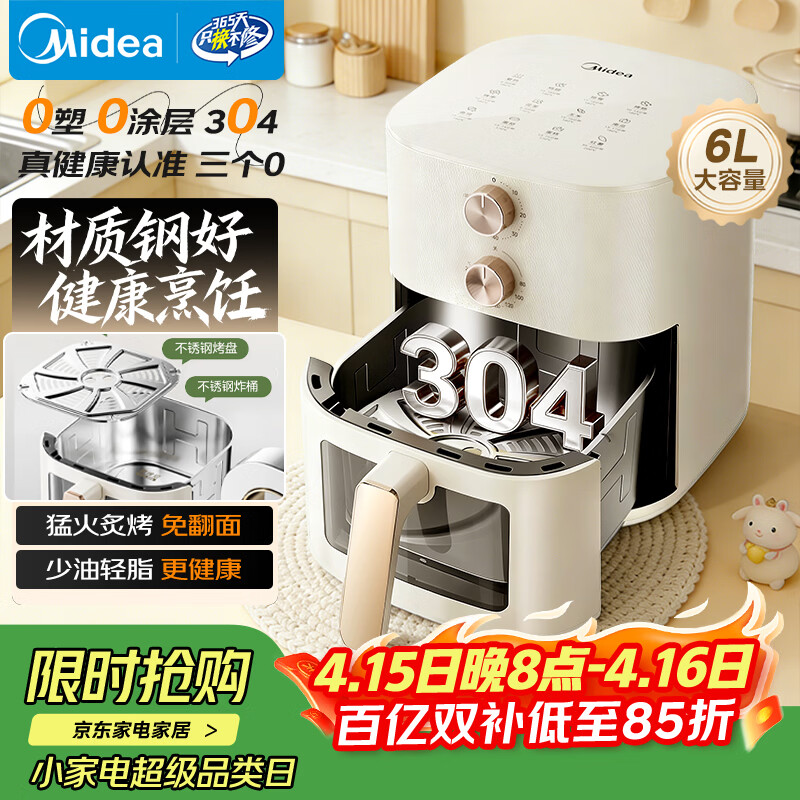 美的(Midea)0涂层不锈钢空气炸锅蒸烤一体2026年新款 家用6L大容量金属内腔 多功能可视空气炸锅MF-KZE6086PRO