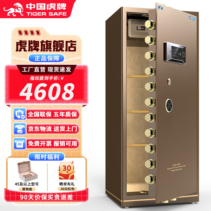 虎牌【CSP国标认证 CE欧盟认证】保险柜家用小型办公大型保险箱防火防盗全钢重型加厚防搬走可入墙 高1.5m单门 咖色 指纹款(指纹/密码/钥匙开启)