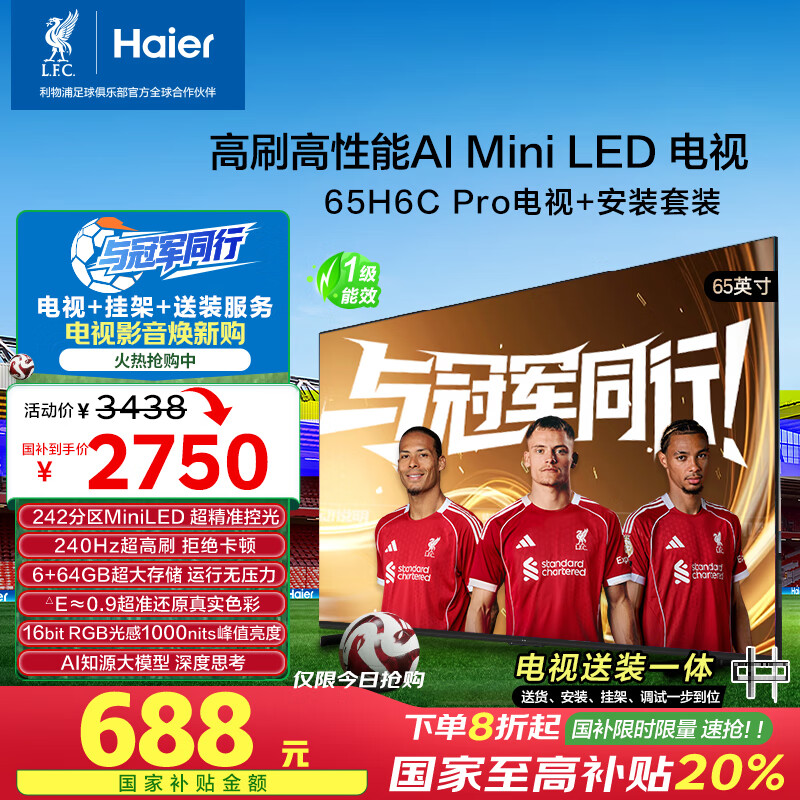 海尔包安装版【固定挂架送装一体】65H6C Pro 65英寸240Hz AI电视242分区背光MiniLED护眼游戏一级能效