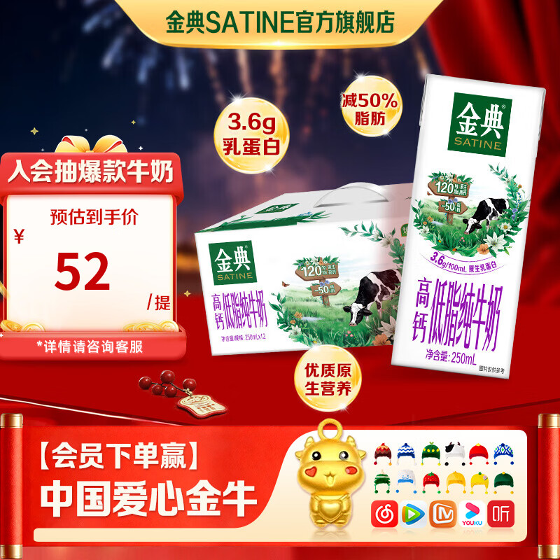 金典(SATINE)高钙低脂纯牛奶250ml*12盒 3.6g乳蛋白 伊利牛奶整箱送礼 9月产 高钙低脂纯牛奶