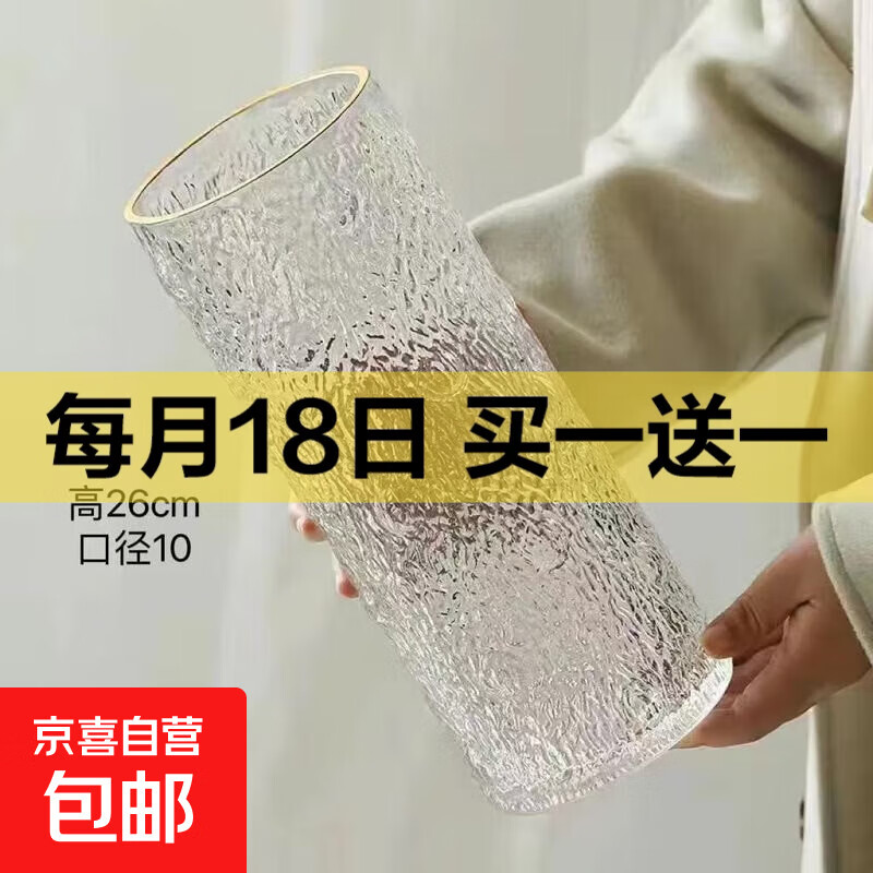 大号家用加厚透明玻璃花瓶摆件富贵竹水培百合干花客厅餐桌花瓶 26cm直筒水波纹金口