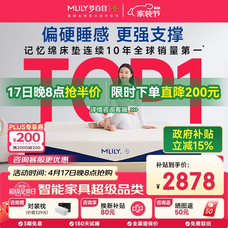 梦百合快充小蓝钻零压记忆棉弹簧床垫席梦思政府补贴1.8米x2米适中偏硬