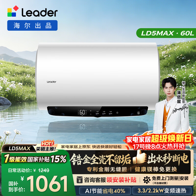 统帅海尔出品60升电热水器京东自营国家补贴一级能效出水断电3300W变频速热锆金全瓷胆镁棒免换LD5MAX