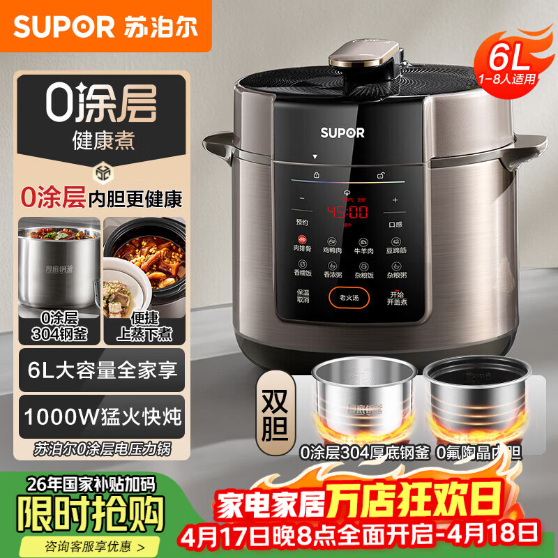 苏泊尔(SUPOR)0涂层健康煮6L大容量全自动家用电压力锅高压锅电饭锅饭煲SY-60YC6003适用6-8人上盖批次随机发货