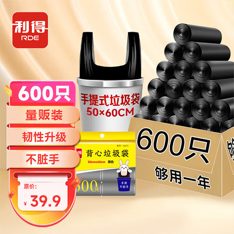利得背心垃圾袋黑色50*60cm600只大号家用手提塑料袋