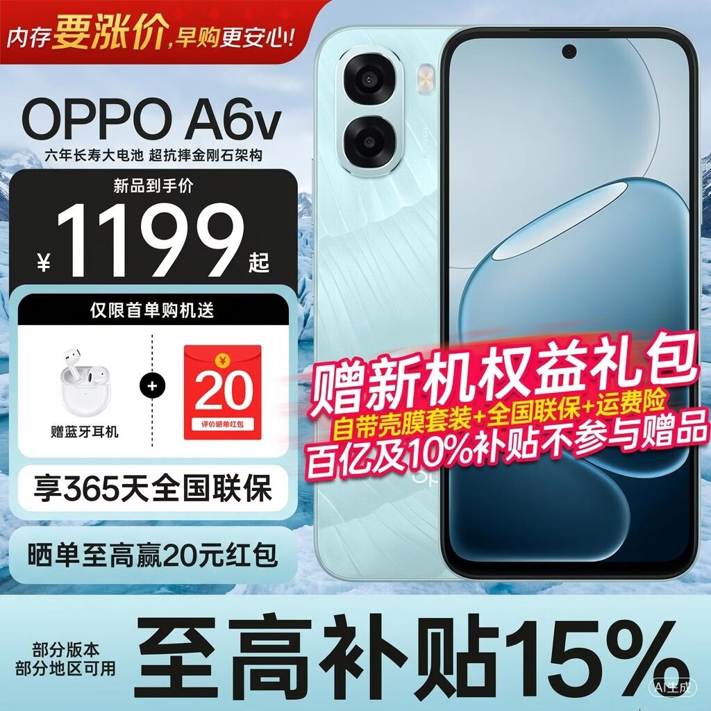 OPPO【国家补贴15%】A6v 5000万超清像素 六年长寿电池 超抗摔金刚石架构 冰川蓝 8GB+256GB 售前咨询客服送【原装耳机/充电宝】