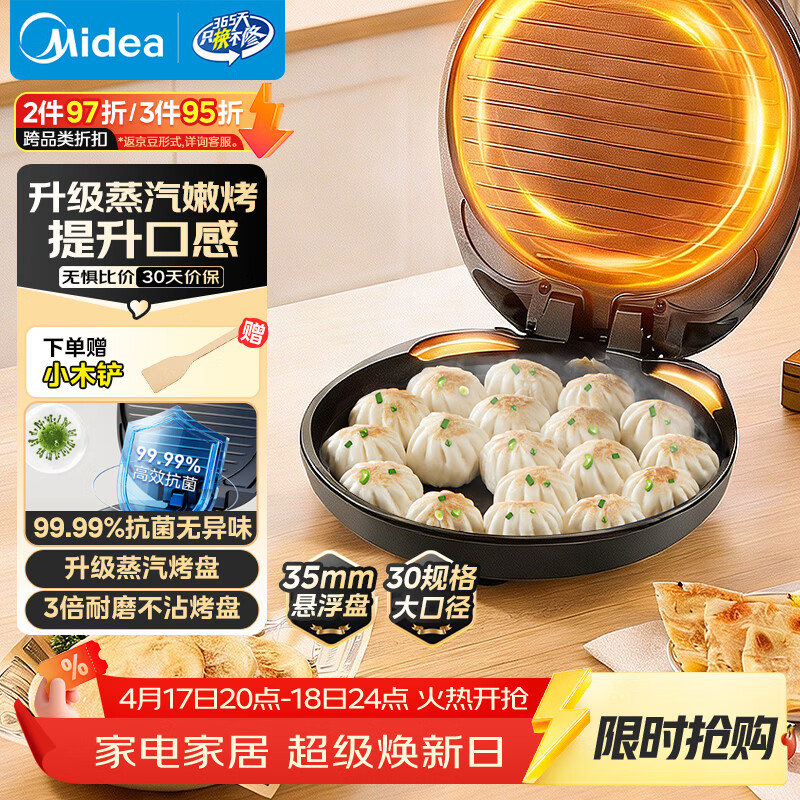 美的(Midea)电饼铛家用煎烤机烙饼锅三明治早餐机蒸汽煎烤盘 大火力烤肉薄饼机双面加热加深电饼档 JKC3051