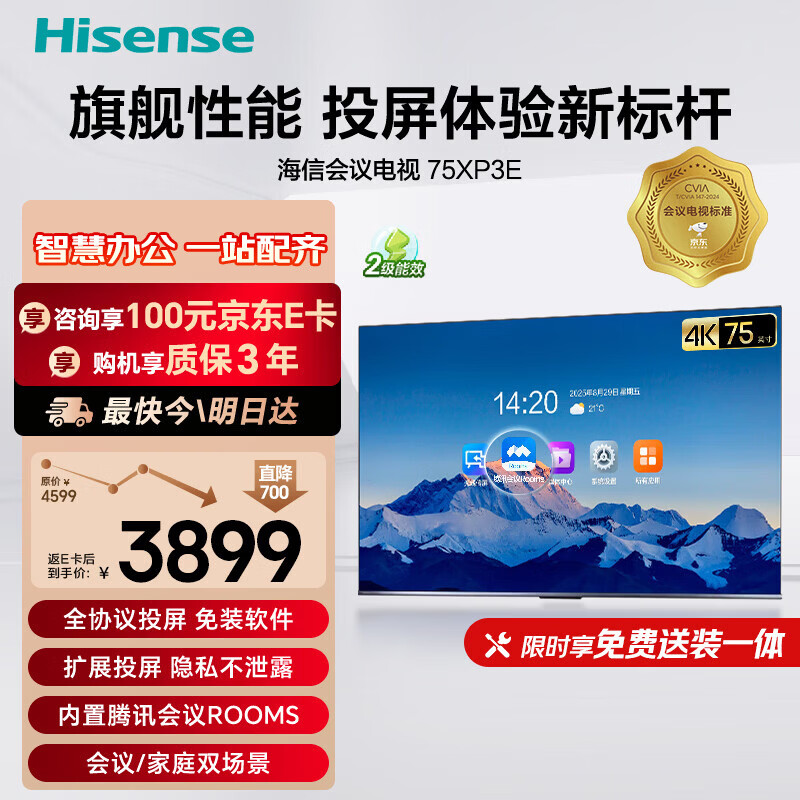 海信75英寸会议电视会议平板电视一体机3+32GB无线投屏会议室显示屏4K办公教学培训显示屏75XP3E