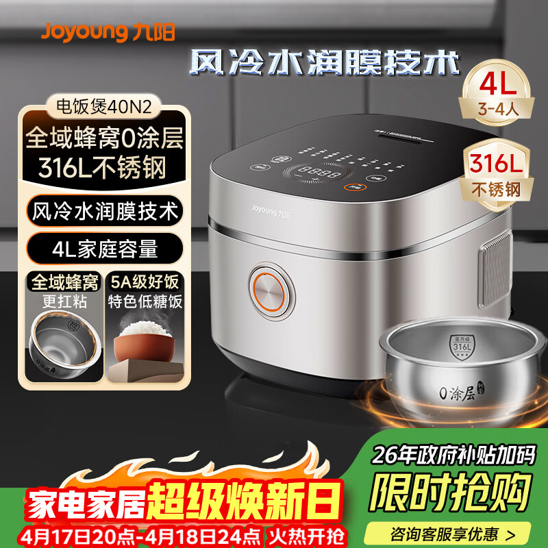 九阳(Joyoung)【全域蜂窝0涂层】316L不锈钢内胆低糖电饭煲电饭锅4升3-4人风冷水润膜家用多功能不粘5A米饭 40N2