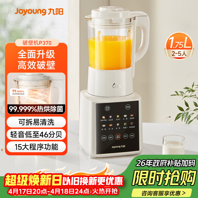九阳(Joyoung)破壁家用全自动1.75L五谷杂粮可拆洗热除菌轻音细腻免滤3-5人用豆浆机破壁机 P370 国家补贴