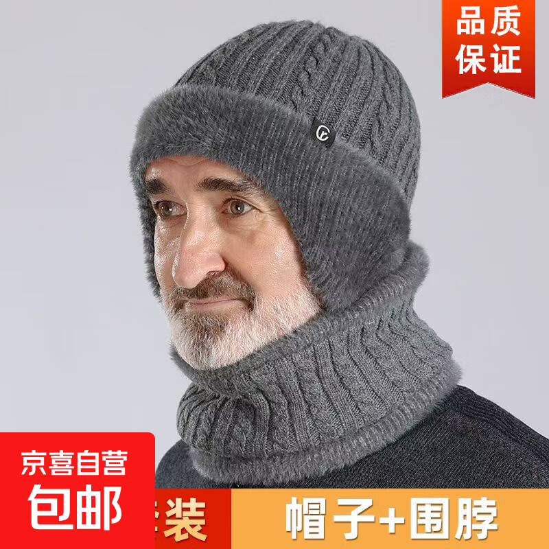 中老年人帽子冬天男士保暖针织帽加绒加厚爸爸爷爷毛线帽护耳棉帽 【冬季保暖套装】灰色帽子+围脖【双倍加厚】