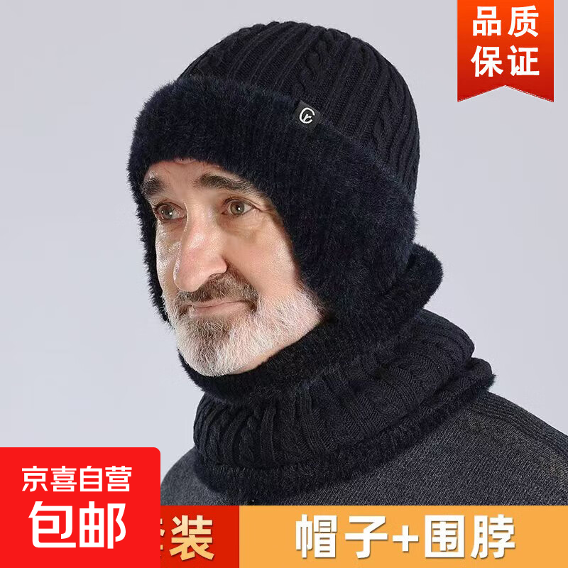 中老年人帽子冬天男士保暖针织帽加绒加厚爸爸爷爷毛线帽护耳棉帽 【冬季保暖套装】藏青帽子+围脖【双倍加厚】