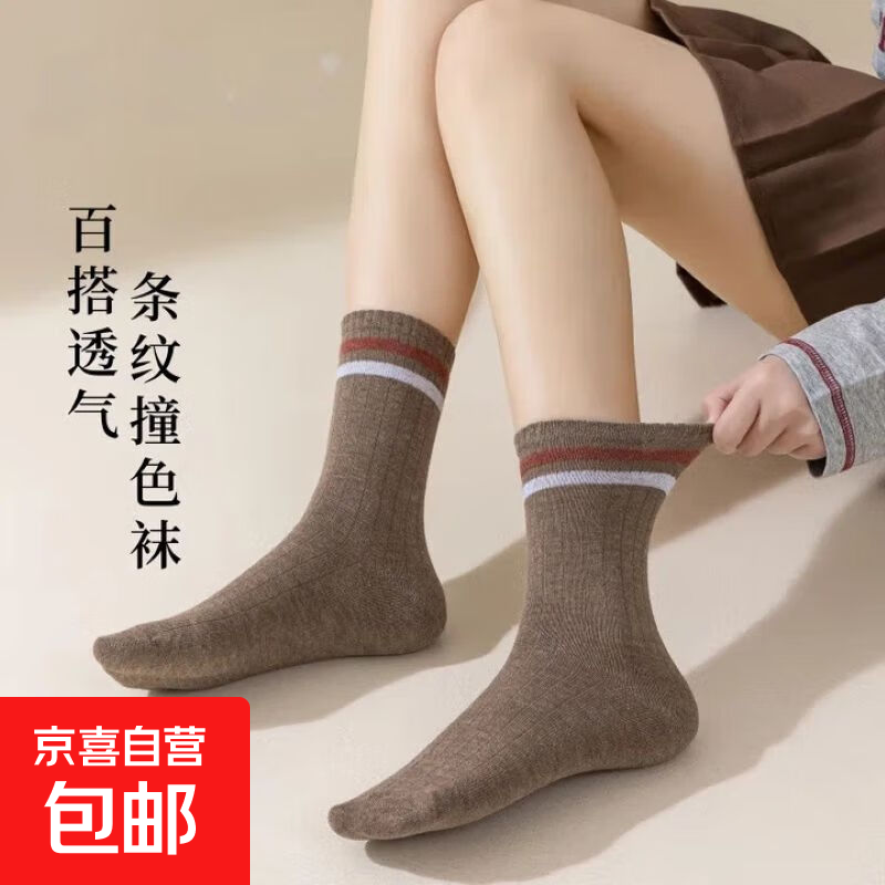 袜子女春秋中筒袜吸汗透气条纹堆堆袜森系学院风女士袜子 六双装/黑色6双 均码