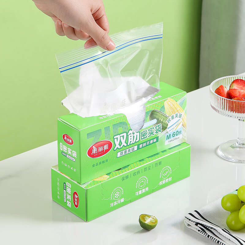 美丽雅收纳袋 食品级加厚自封袋 家用厨房分装收纳袋防水防潮可微波炉 中号60只装