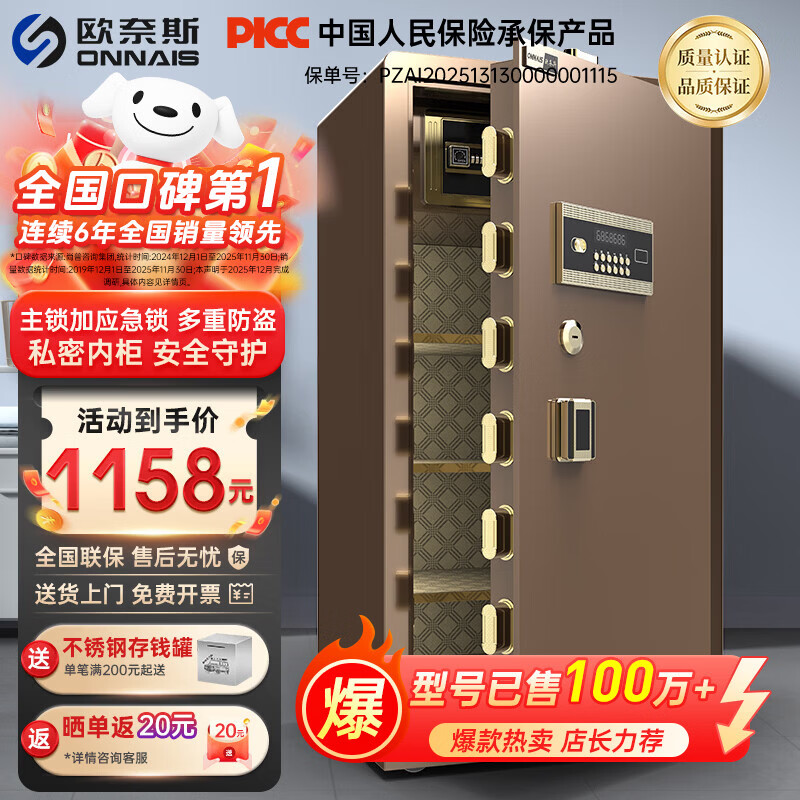 欧奈斯ONNAIS保险柜家用防盗防搬走小型保险箱办公室防火智能床头柜一体保管箱隐形内嵌入墙衣柜保险柜 1.2米咖啡金电子密码(私密内柜)