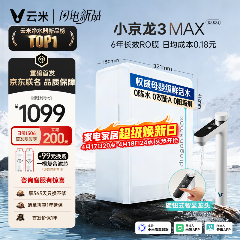 云米(VIOMI)小京龙3Max1000G厨下净水器6年长效RO膜反渗透家用用大通量0陈水0阻垢母婴直饮净水机VR1032