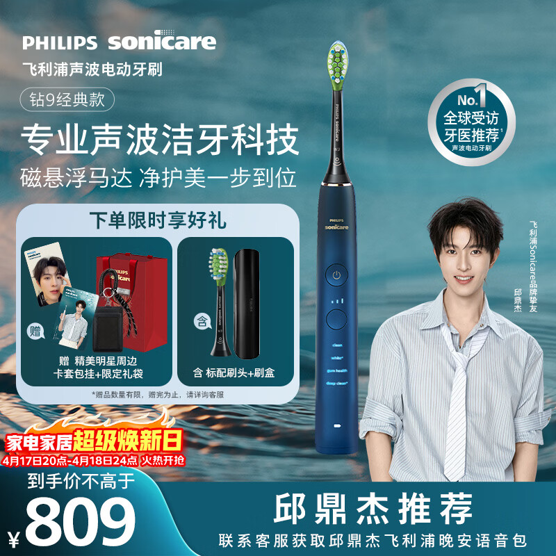 飞利浦(PHILIPS)邱鼎杰推荐声波电动牙刷钻石9系 10倍洁净去除99.9%牙渍 生日礼物 情侣送男生女友HX9911/62蓝