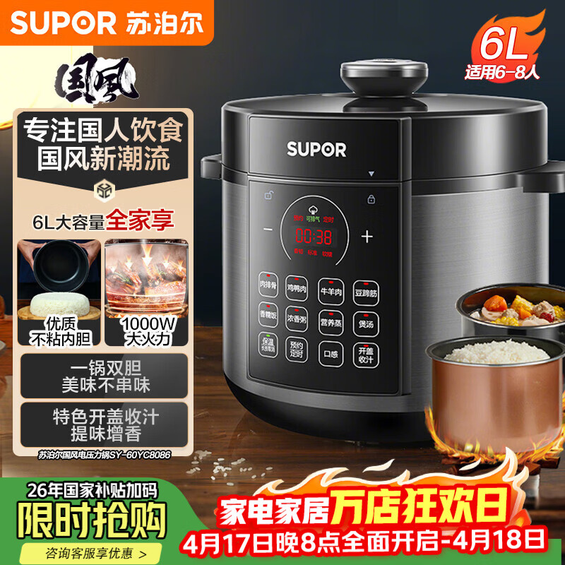 苏泊尔(SUPOR)国风系列电压力锅6L大容量智能预约 煲汤小米粥双胆 60YC8086电饭煲高压锅6-8人内胆批次随机发货