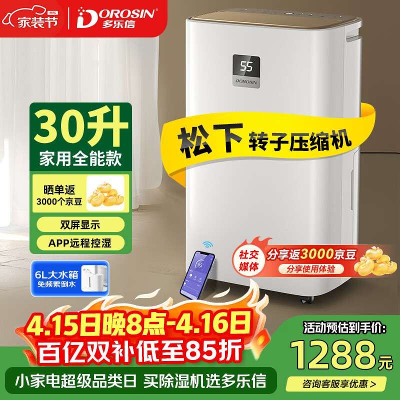 多乐信(DOROSIN)家用除湿机 除湿量30升/天 60㎡ 地下室除潮干衣除湿吸湿器APP智控负离子干燥机ER-630ES