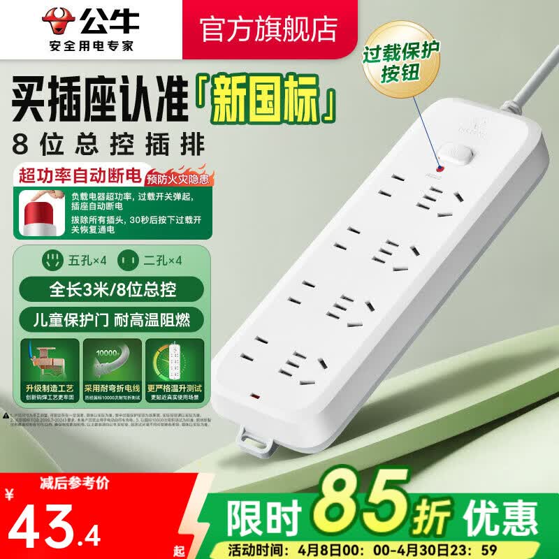 公牛(BULL) 插座/B5系列 带儿童保护门/新国标插座/排插 【8位】总控3米(新国标防过载)B5440