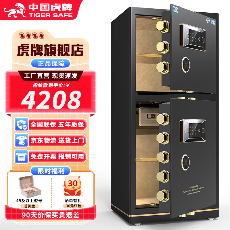 虎牌【CSP国标认证 CE欧盟认证】保险柜家用小型办公大型保险箱防火防盗全钢重型加厚防搬走可入墙 高1.2m双门 咖色 指纹款(指纹/密码/钥匙开启)