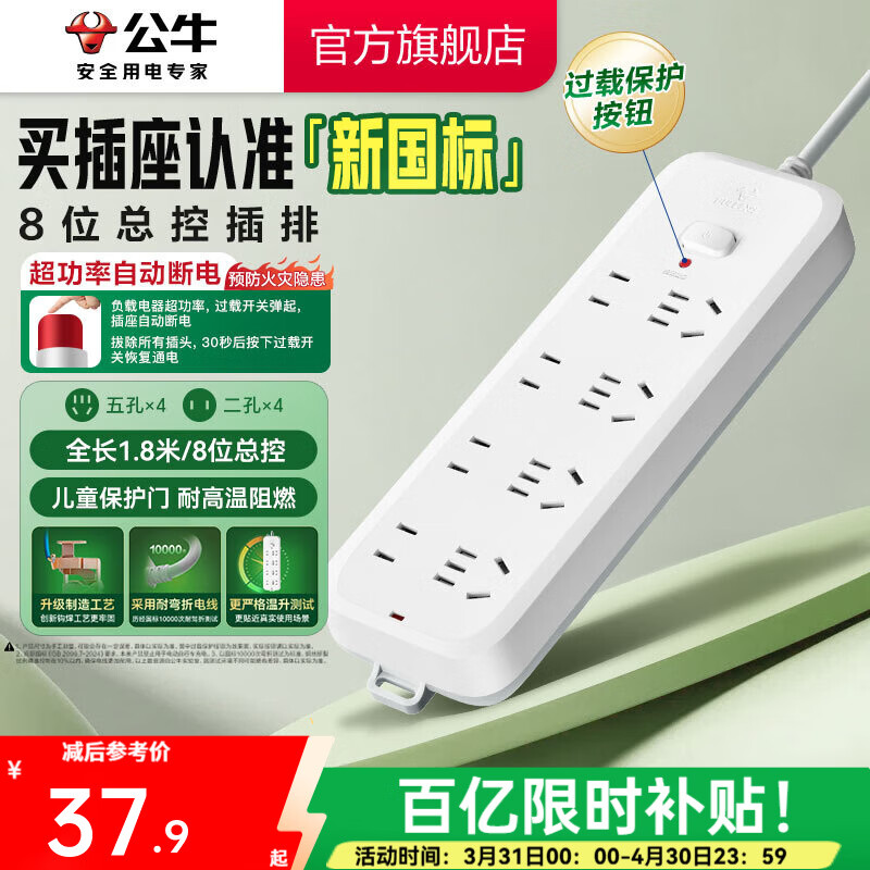 公牛(BULL) 插座/B5系列 带儿童保护门/新国标插座/排插 【8位】总控1.8米(新国标防过载)B5440