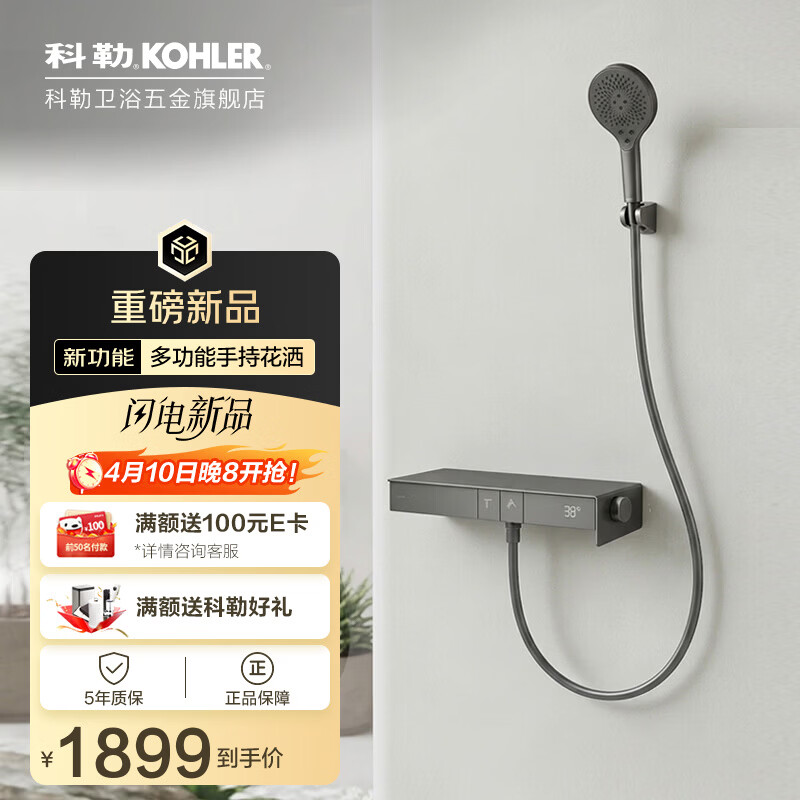 科勒(KOHLER)数显恒温淋浴花洒两出水雨神大置物台按键控制增压喷头浴缸花洒 雨神SH10Air 墨影灰