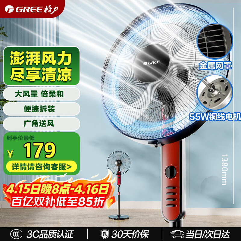 格力(GREE)【巨风量】落地扇远吹风电风扇台式电扇易拆洗广角摇头节能定时轻音风扇落地扇 FD-4010-WG