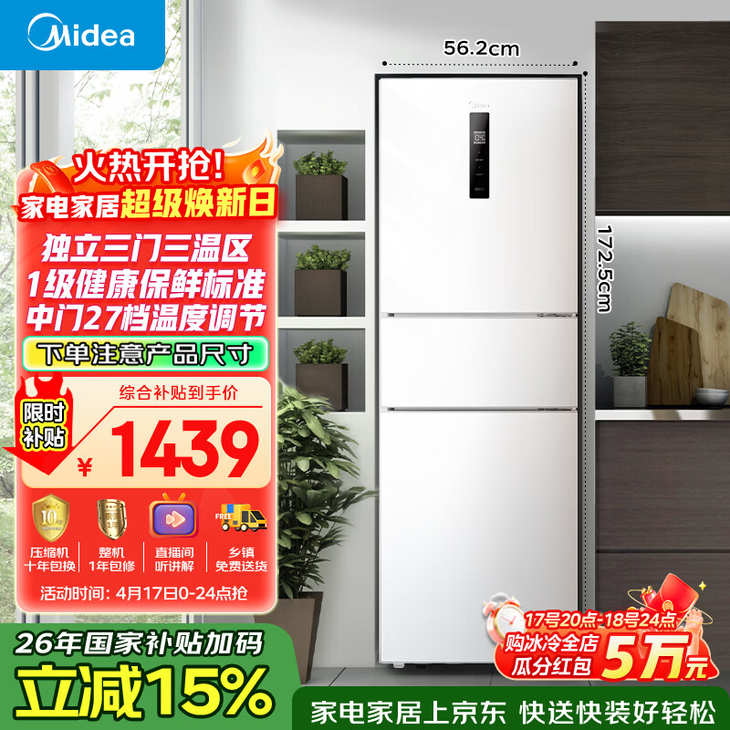 美的(Midea)239升三门冰箱白色家用小户型三开门风冷变频一级能效节能宿舍租房电冰箱MR-251WTPE【国家补贴】