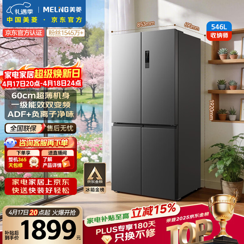 美菱收纳师546L十字门冰箱双变频一级能效冰箱四开门家用大容量风冷无霜净味BCD-546WP9CX国家补贴
